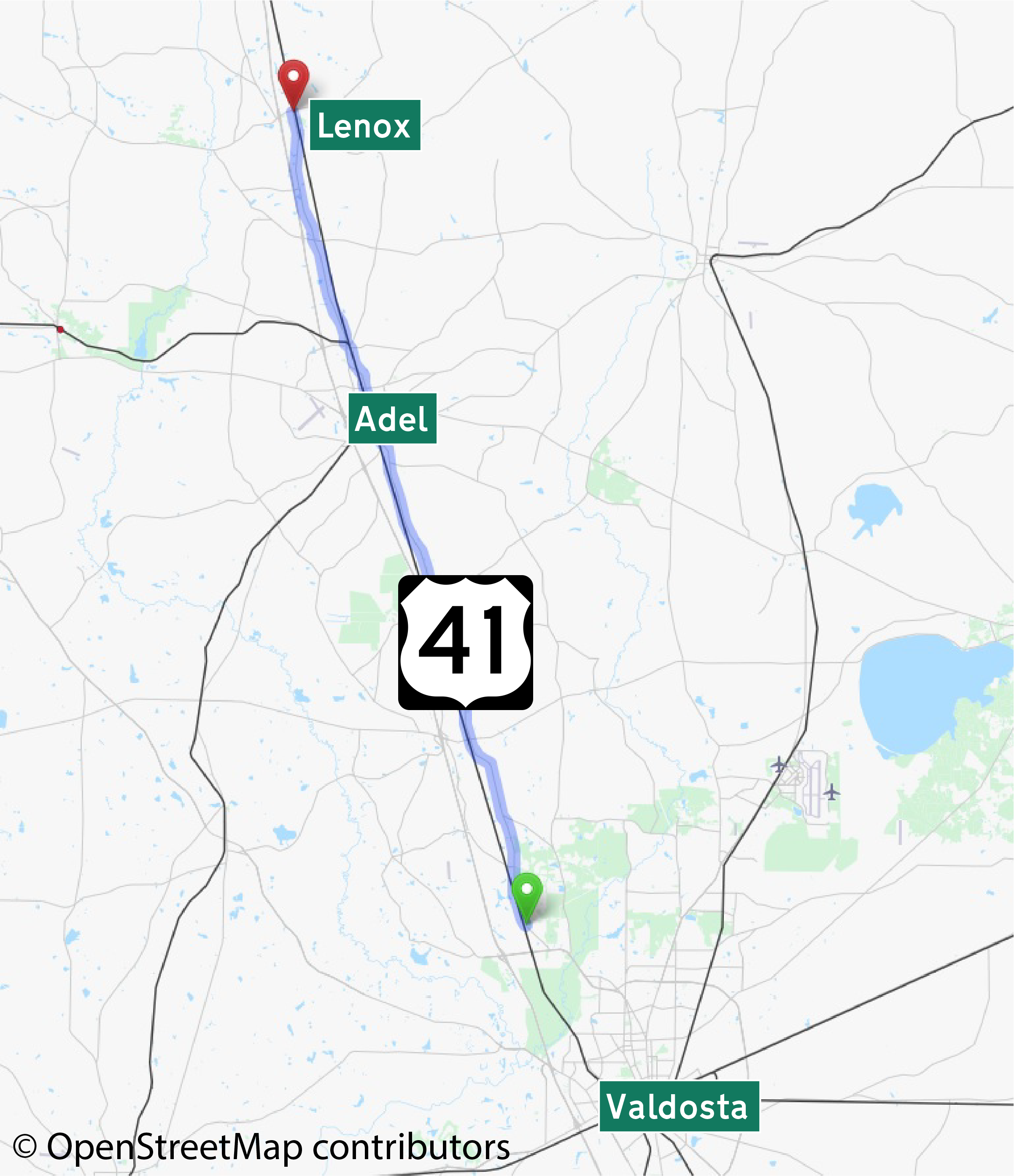 This American auto trail travels from Valdosta to Lenox, Georgia, along U.S. Highway 41.