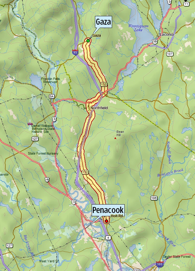 This American auto trail travels from a road junction at Gaza to a point east of Penacook, New Hampshire.