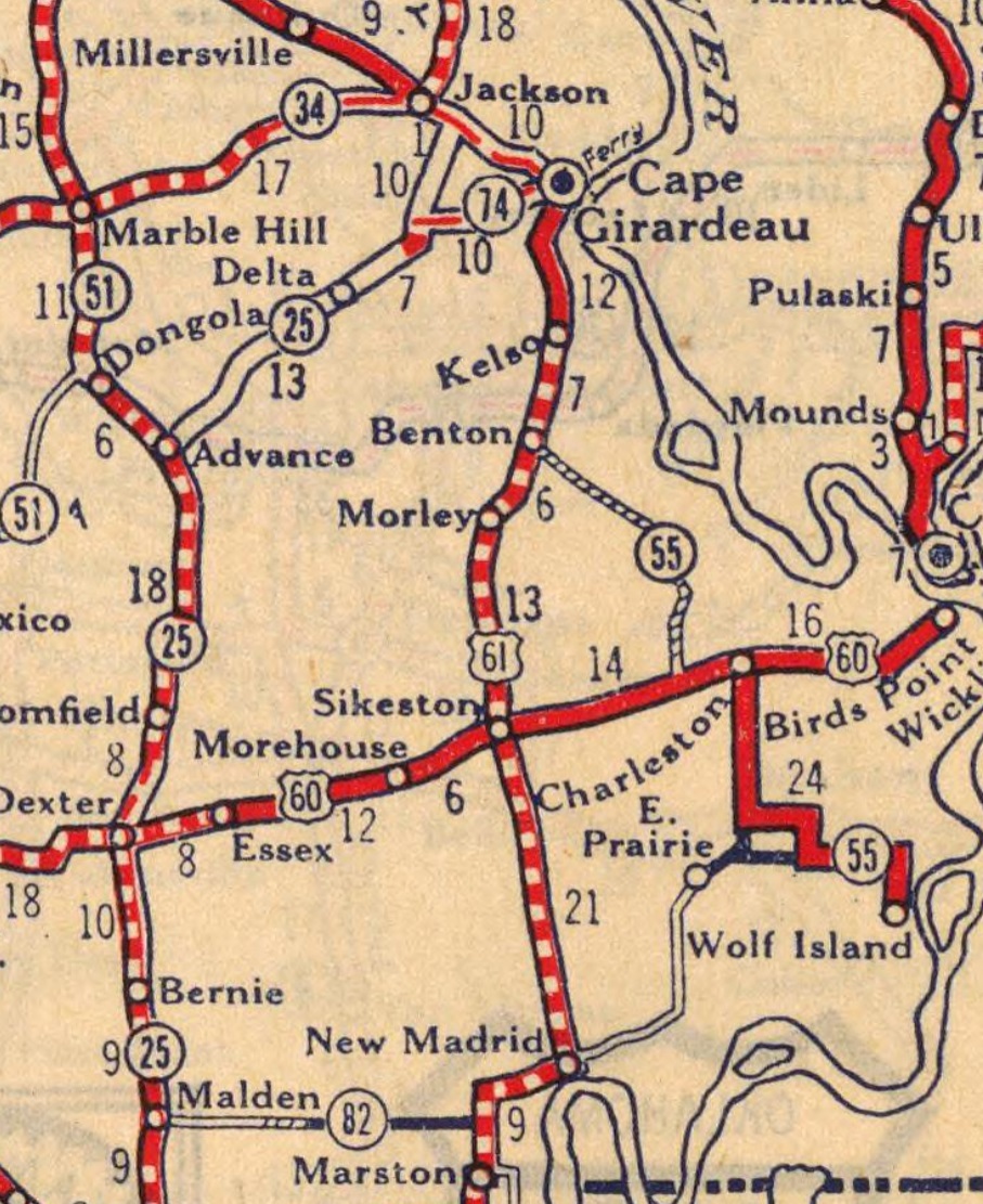 This American auto trail follows the former route of the Mississippi River Scenic Highway, from Sikeston to Scott City, Missouri.