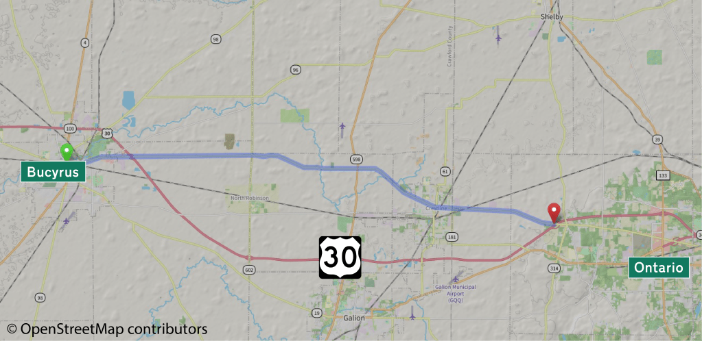 This American auto trail explores the original route of the Lincoln Highway in north central Ohio, between here in Bucyrus and Ontario.