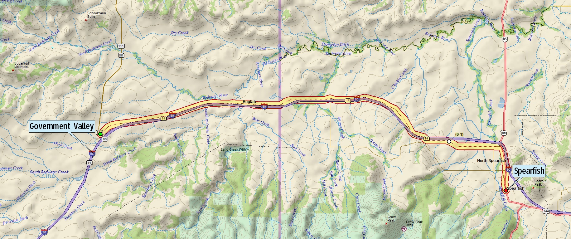 The route begins at Government Valley in eastern Wyoming and crosses the state line to Spearfish, South Dakota.