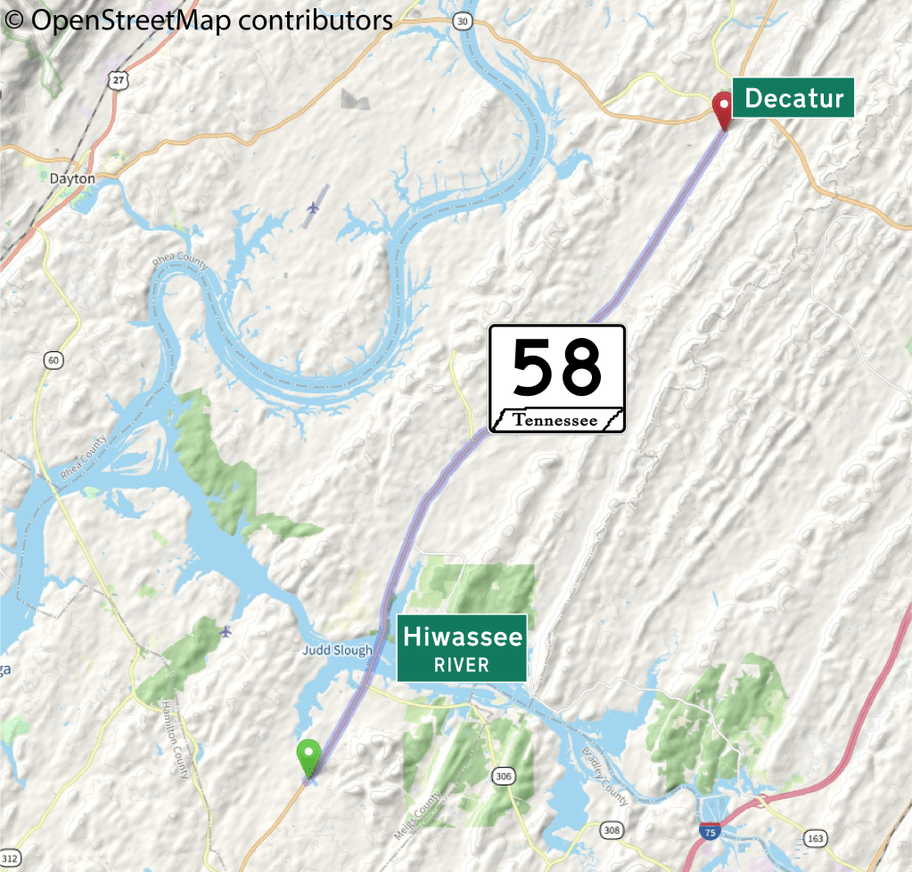 This American auto trail explores a section of Tennessee Highway 58 from the Hiwassee River to Decatur.