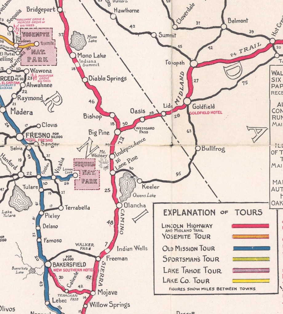 This American auto trail follows the route of the 1910s Roosevelt Midland Trail along the eastern side of California’s Sierra Nevada.