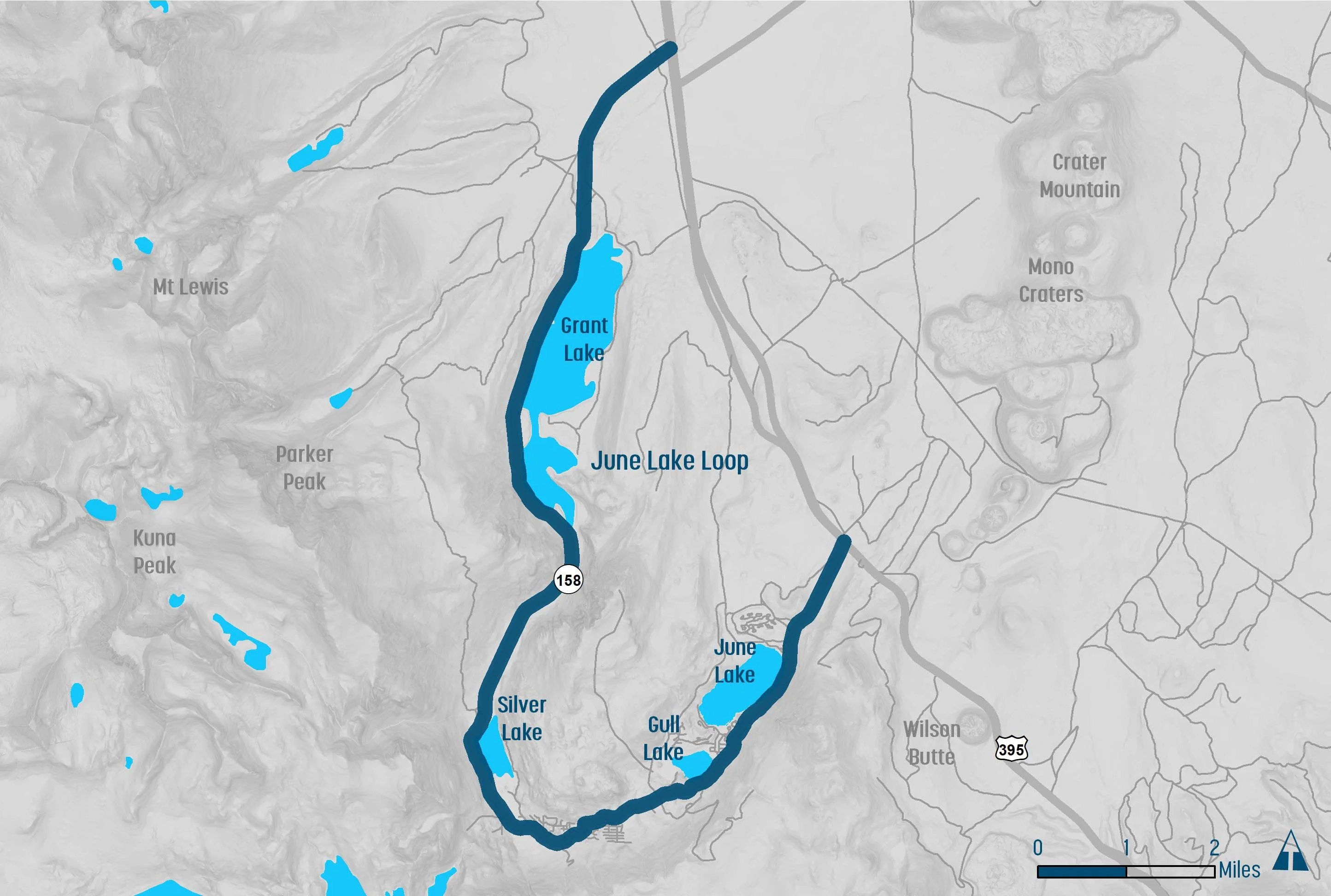 The travel route begins at the turnoff for Mammoth Lakes and drives U.S. Highway 395 north to Lee Vining.