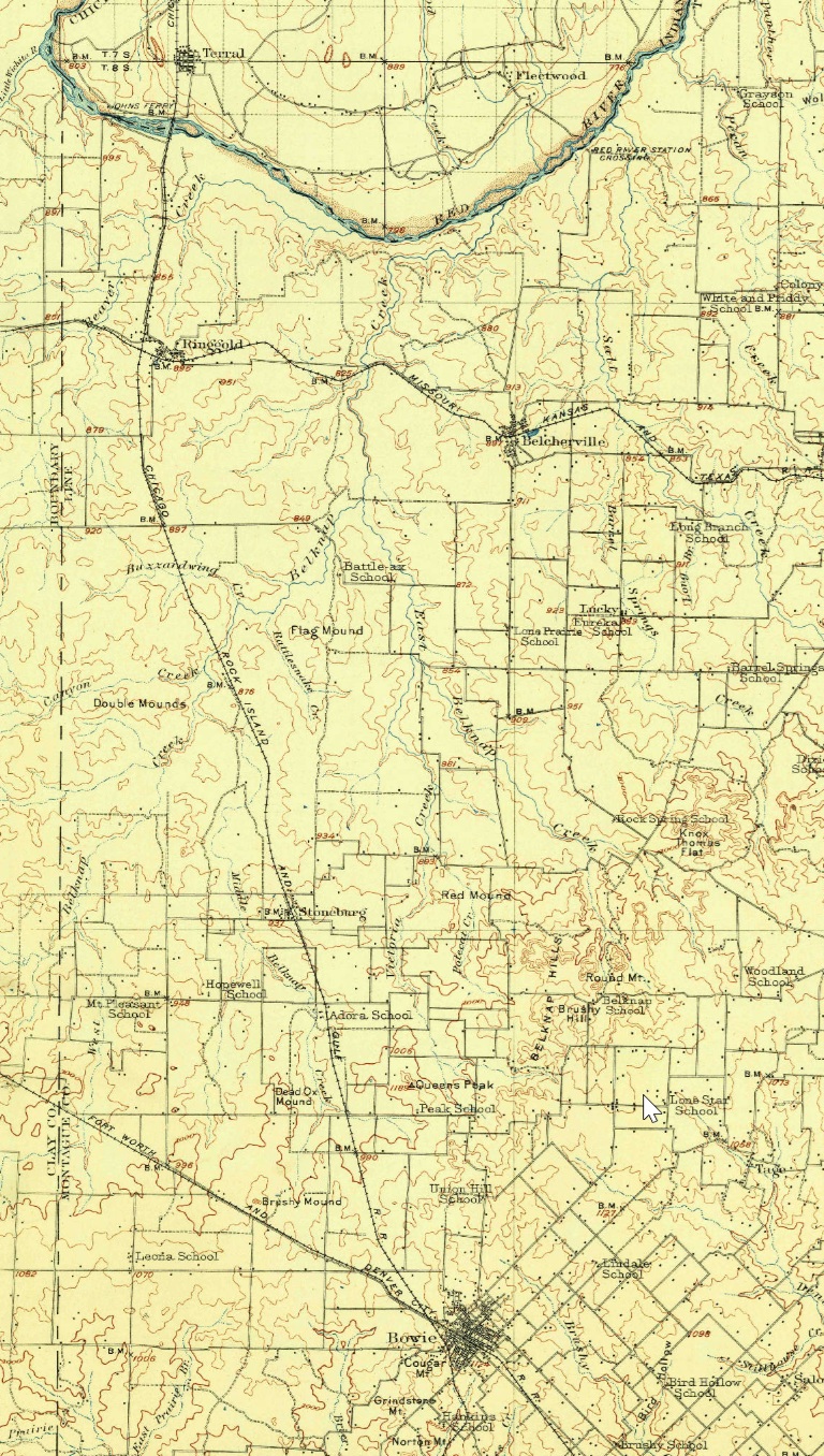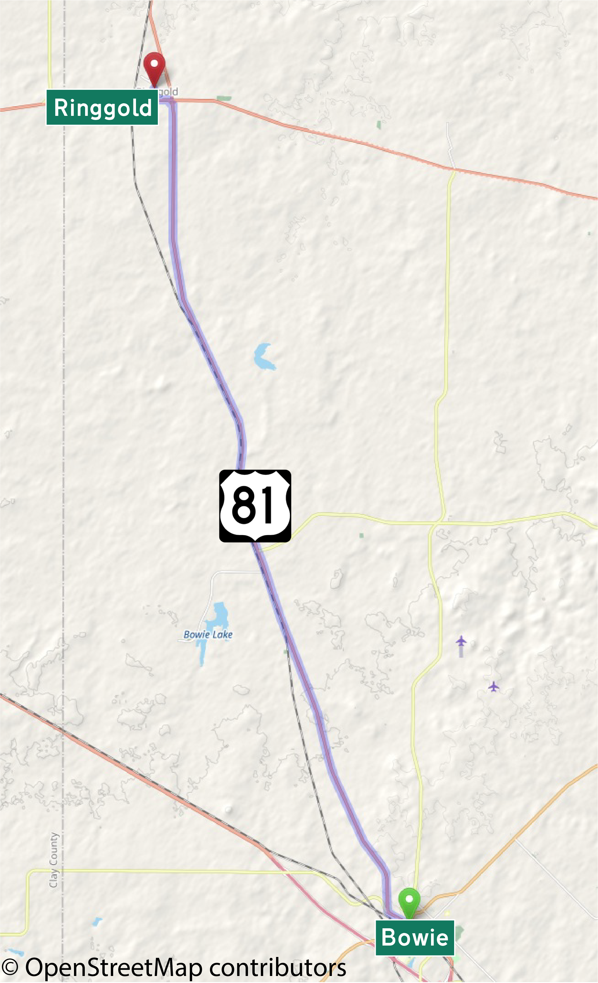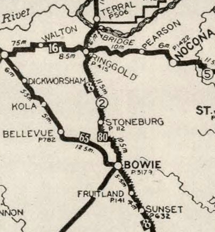 This American auto trail traces the famed Meridian Highway from Bowie north to Ringgold, Texas.
