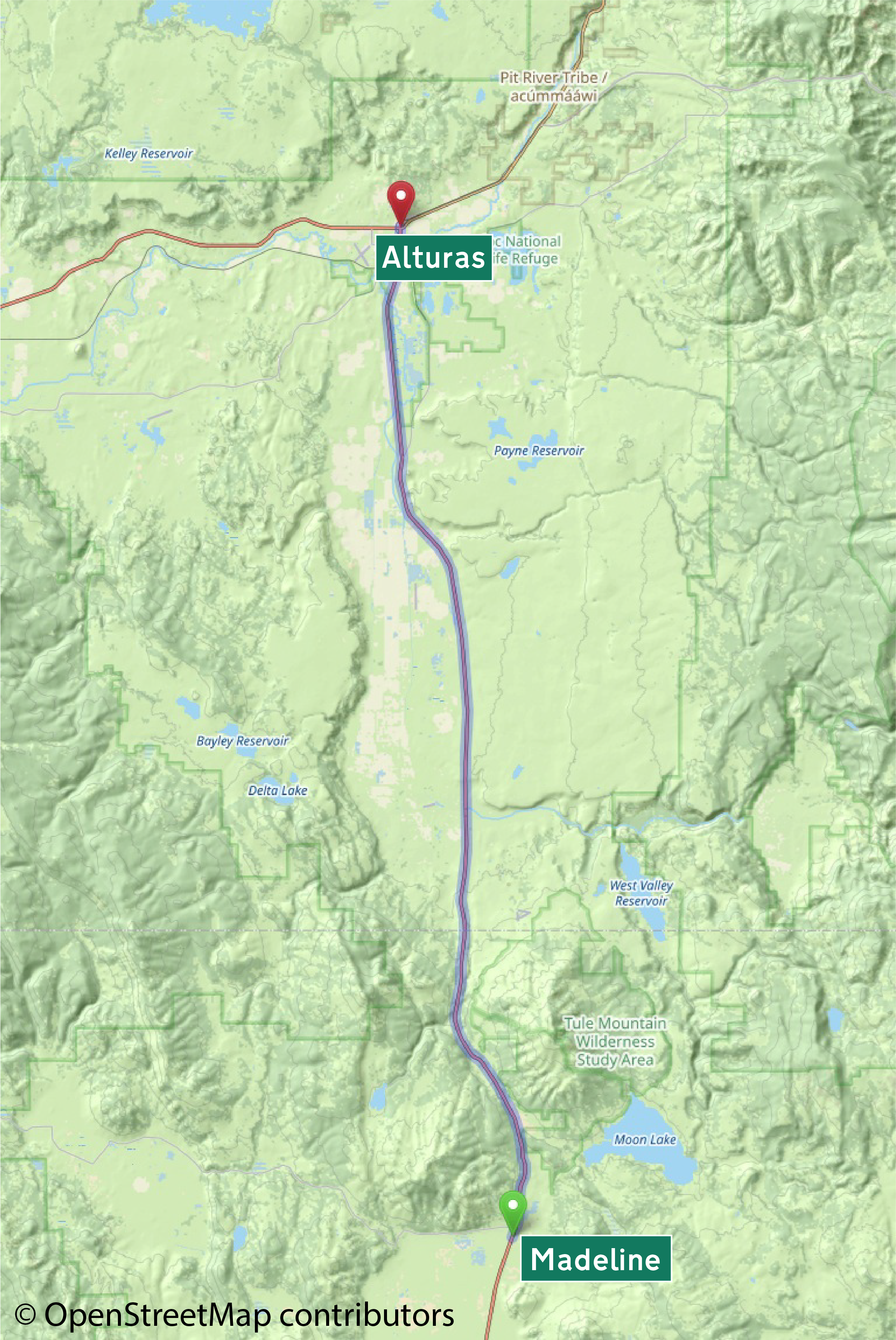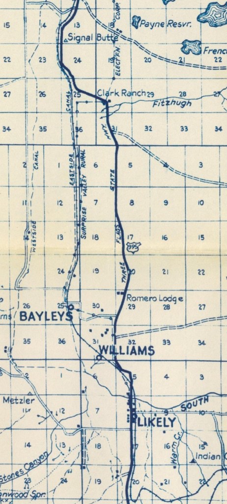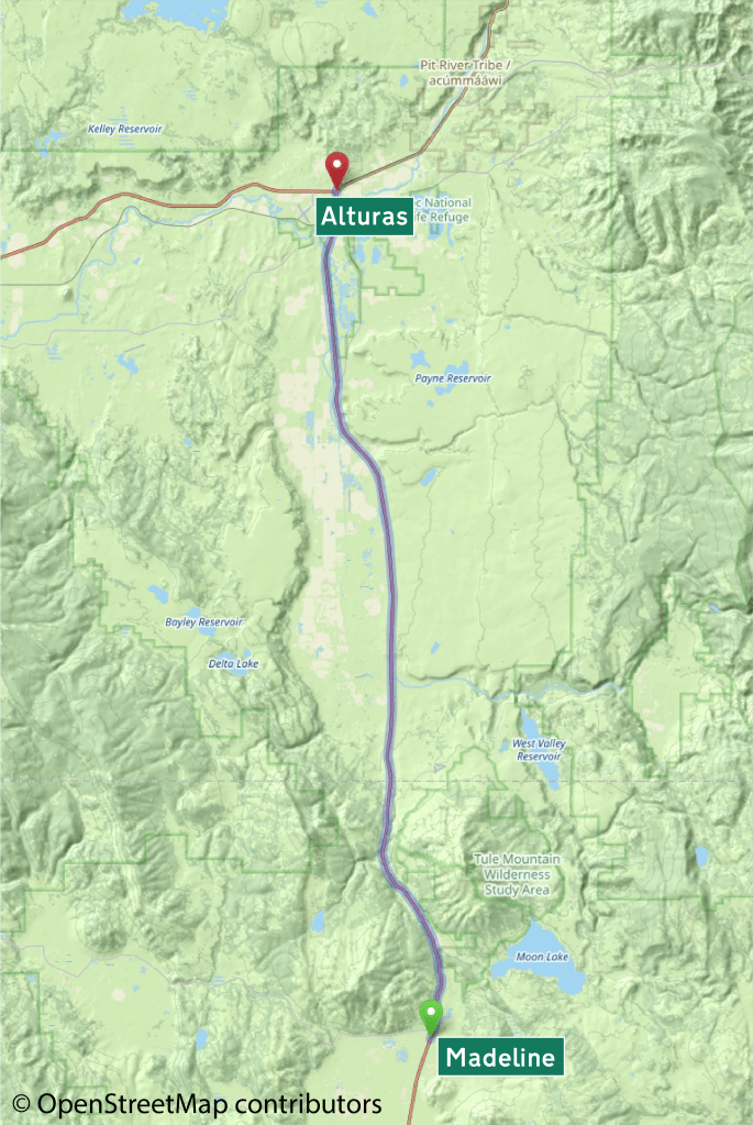 This American auto trail follows the 1930s Three Flags Highway, today’s U.S. Highway 395, from Madeline to Alturas, California.