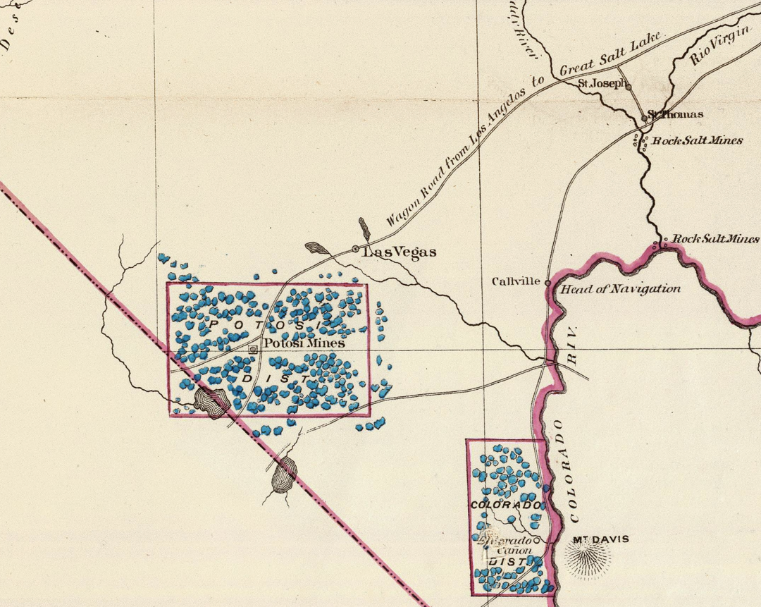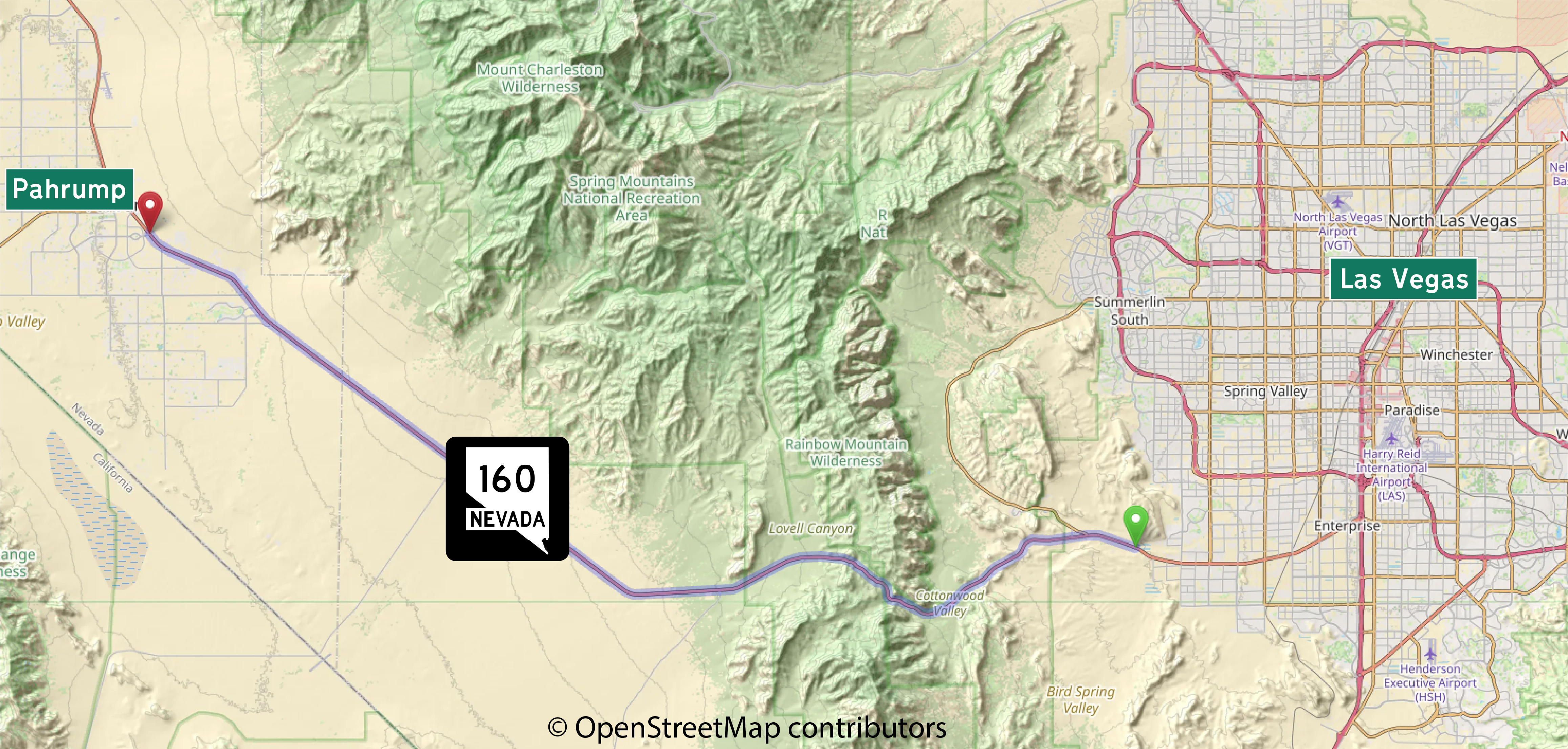 The travel route starts on the western outskirts of Las Vegas and ends at Pahrump, Nevada.