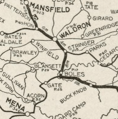 From the intersection, known as the community of Needmore, the travel route follows U.S. 71 south to Acorn.