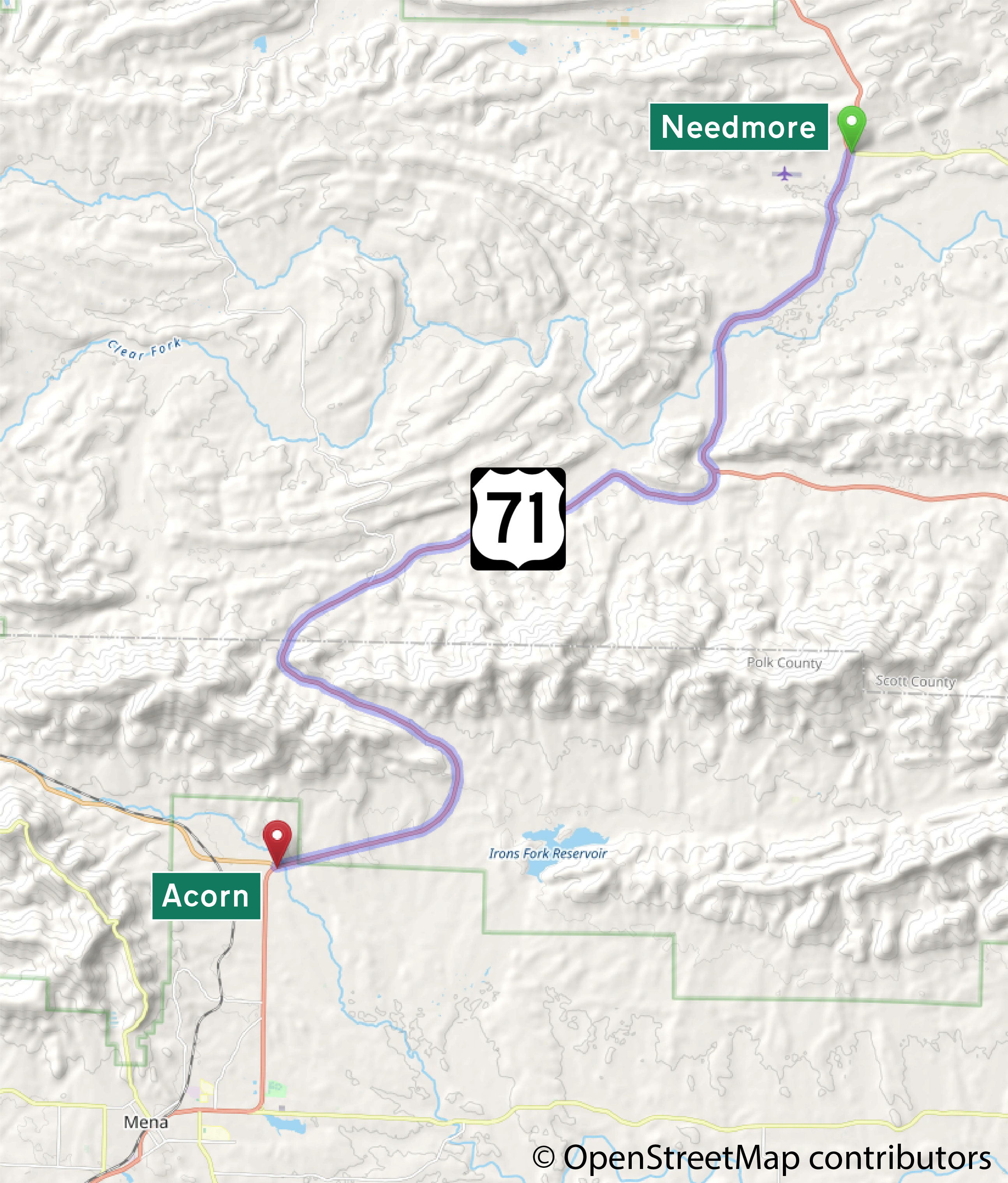 From the intersection, known as the community of Needmore, the travel route follows U.S. 71 south to Acorn.