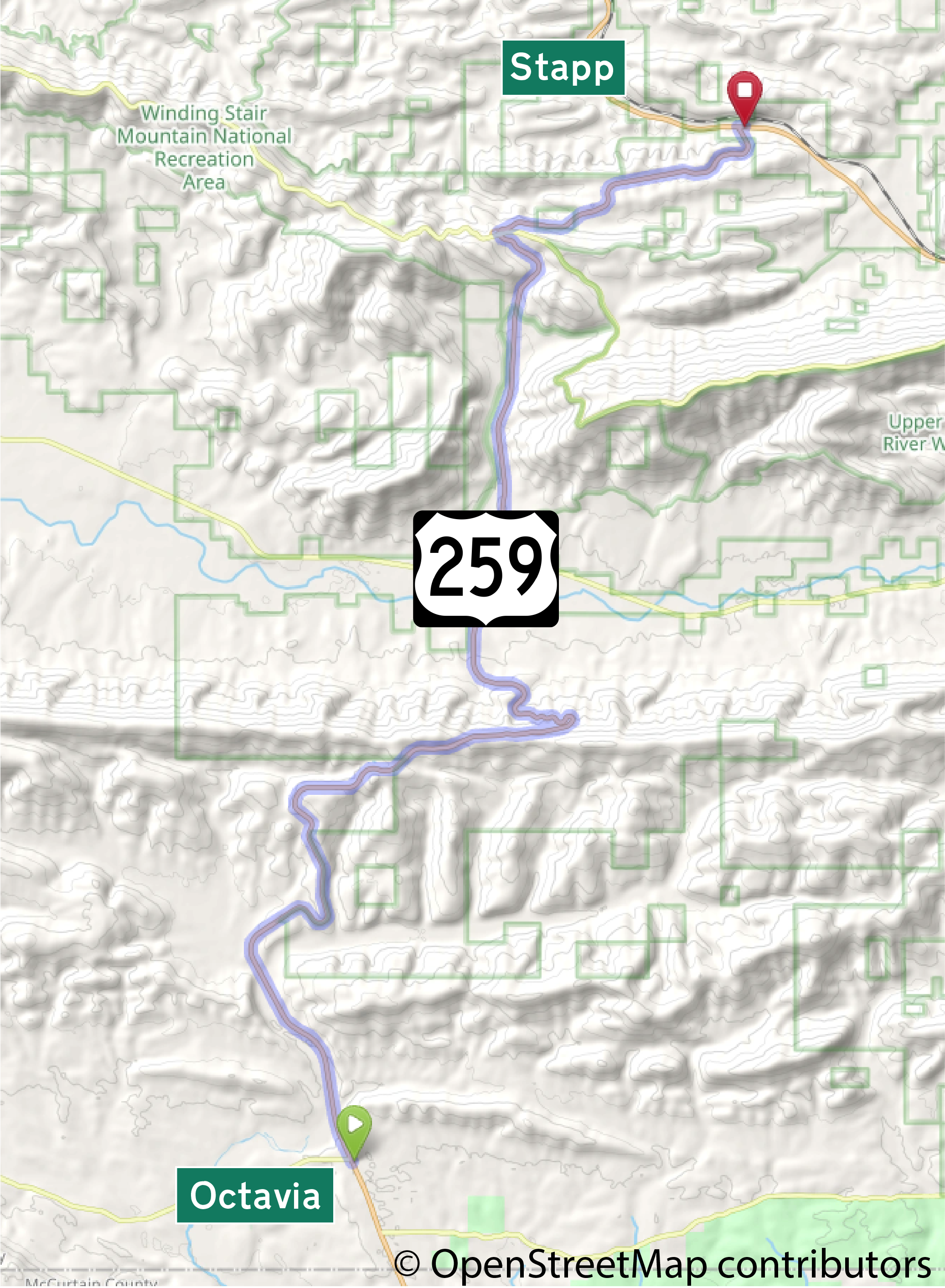 This American auto trail follows the Mountain Pass Scenic Byway in southeastern Oklahoma. The route travels from Octavia north to the junction with U.S. Highways 59 and 270.