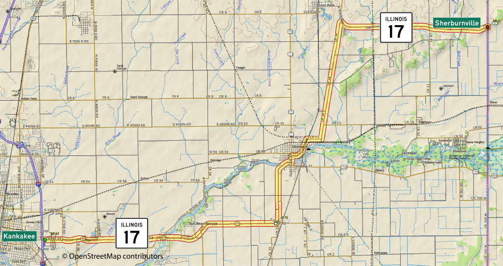 Along the way, it crisscrosses the Kankakee River and the railroads at Momence.