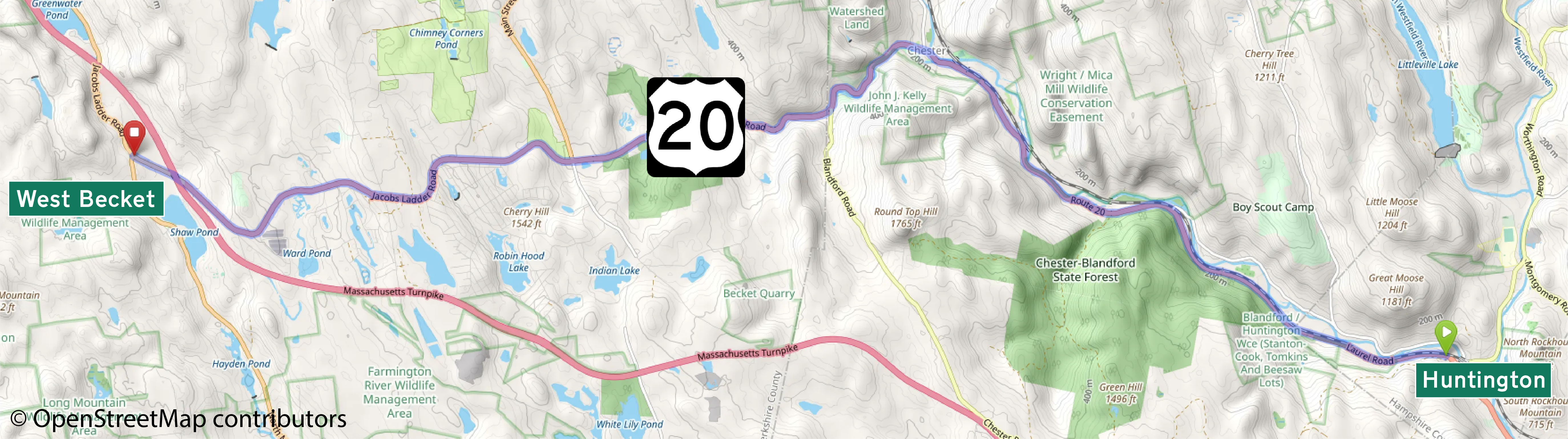 This American auto trail explores a section of U.S. Highway 20 in west central Massachusetts, from Huntington to West Becket.