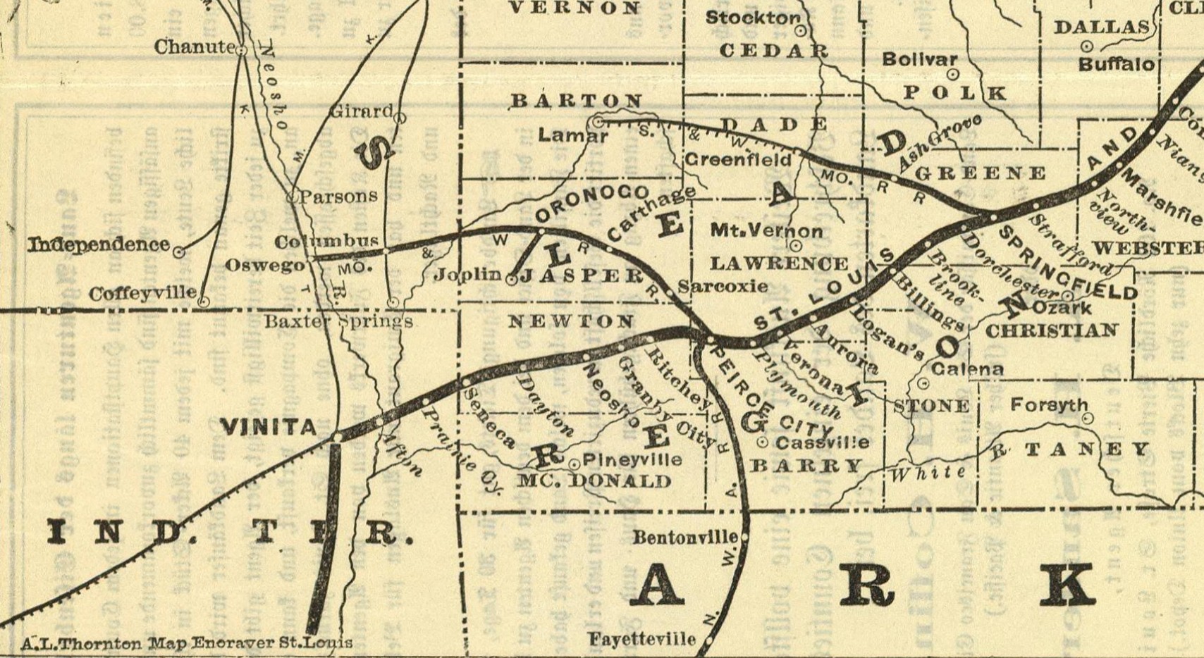 The travel route closely follows the former tracks of the St. Louis-San Francisco (Frisco) Railway.