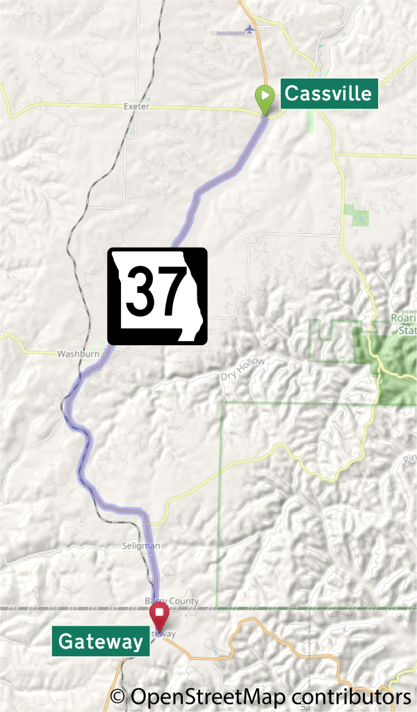 This short American auto trail explores a section of southwestern Missouri along Highway 37 to Gateway, Arkansas.