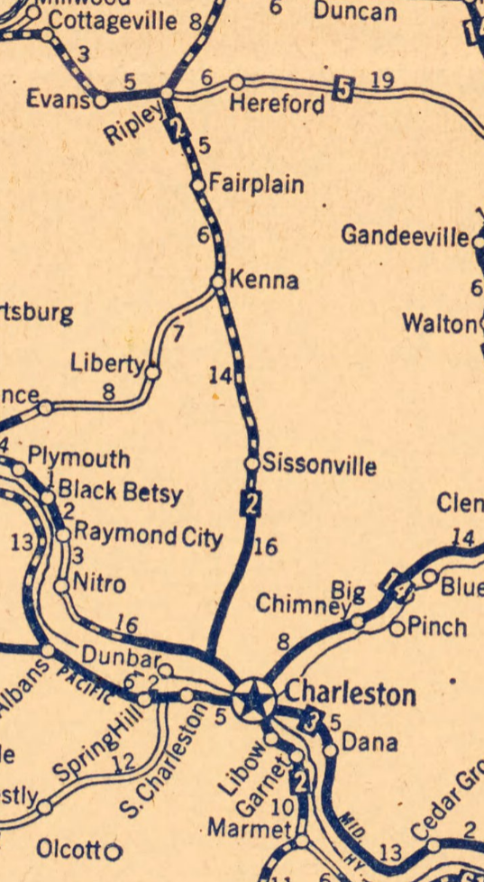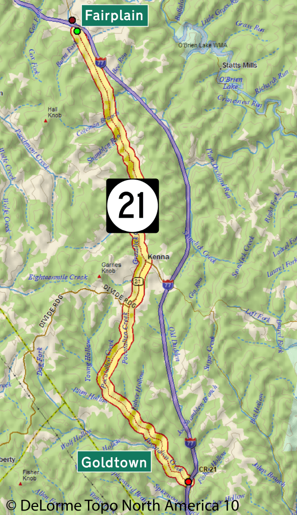 This American auto trail travels through West Virginia’s Appalachian Mountains, from Fairplain south to Goldtown.