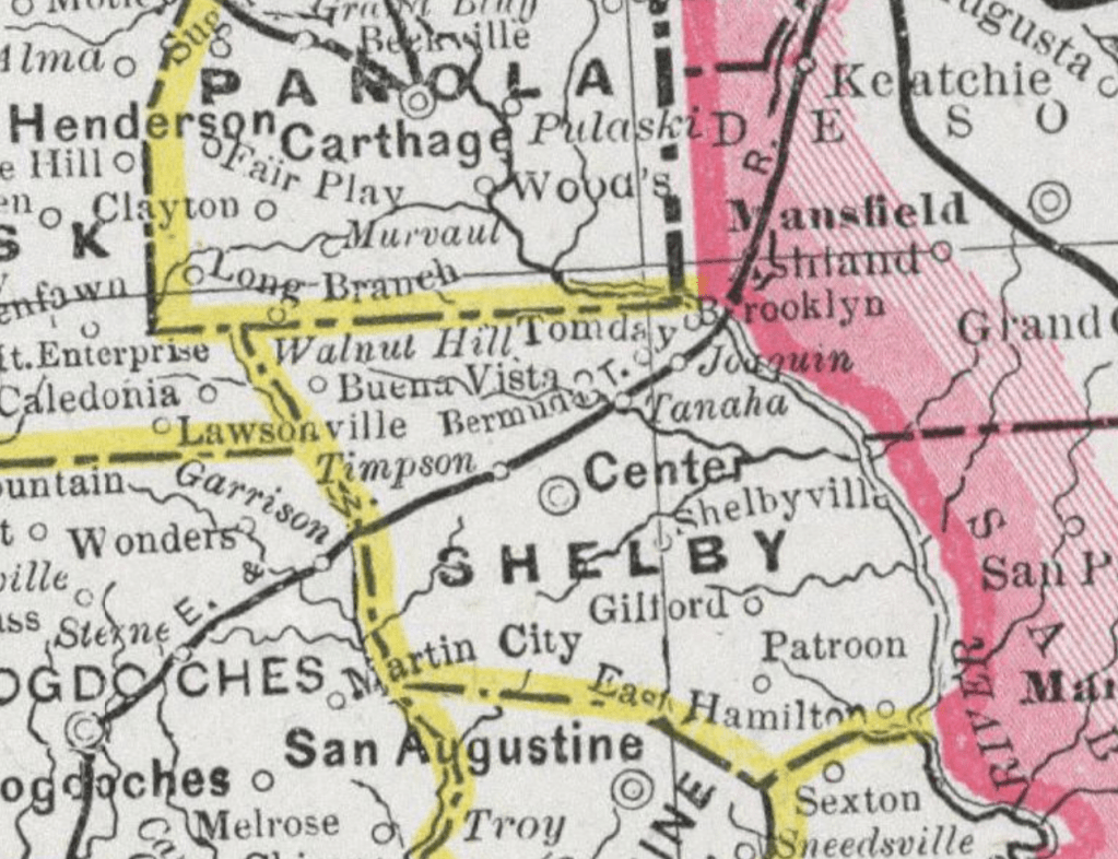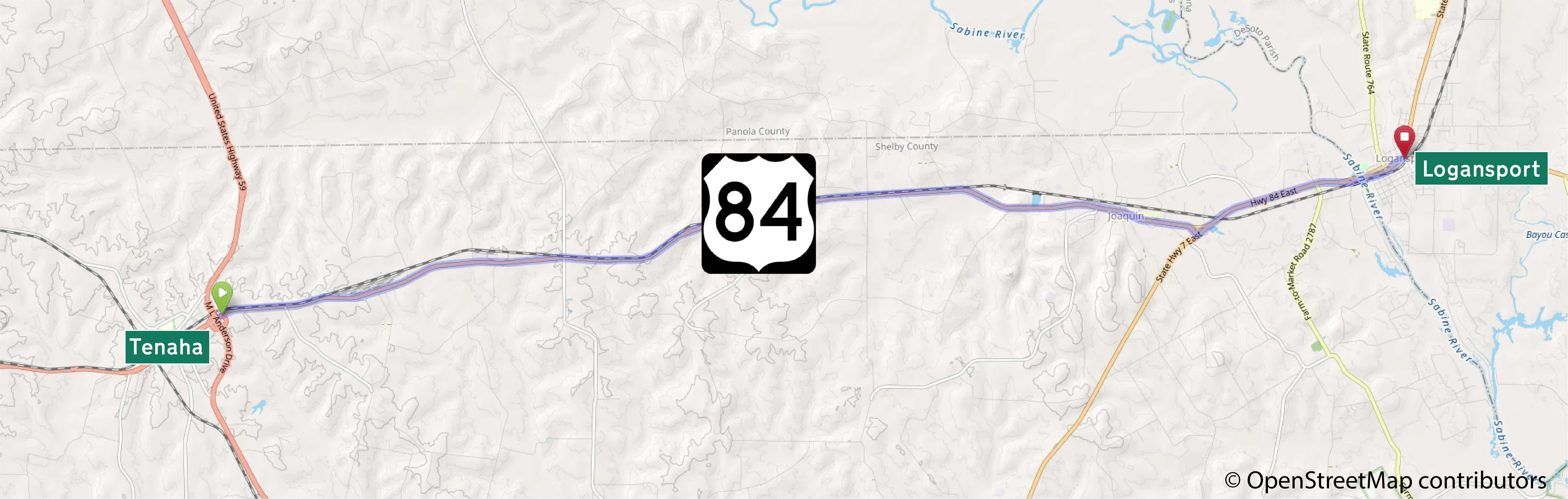 The travel route begins in Tenaha, Texas, and travels through northern Shelby County to the Sabine River.