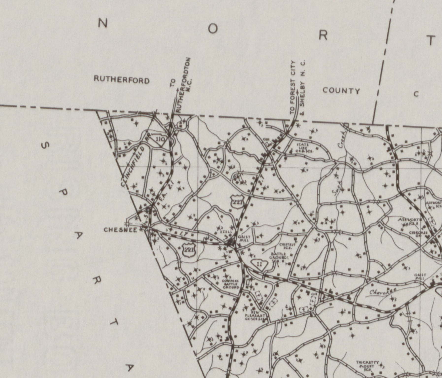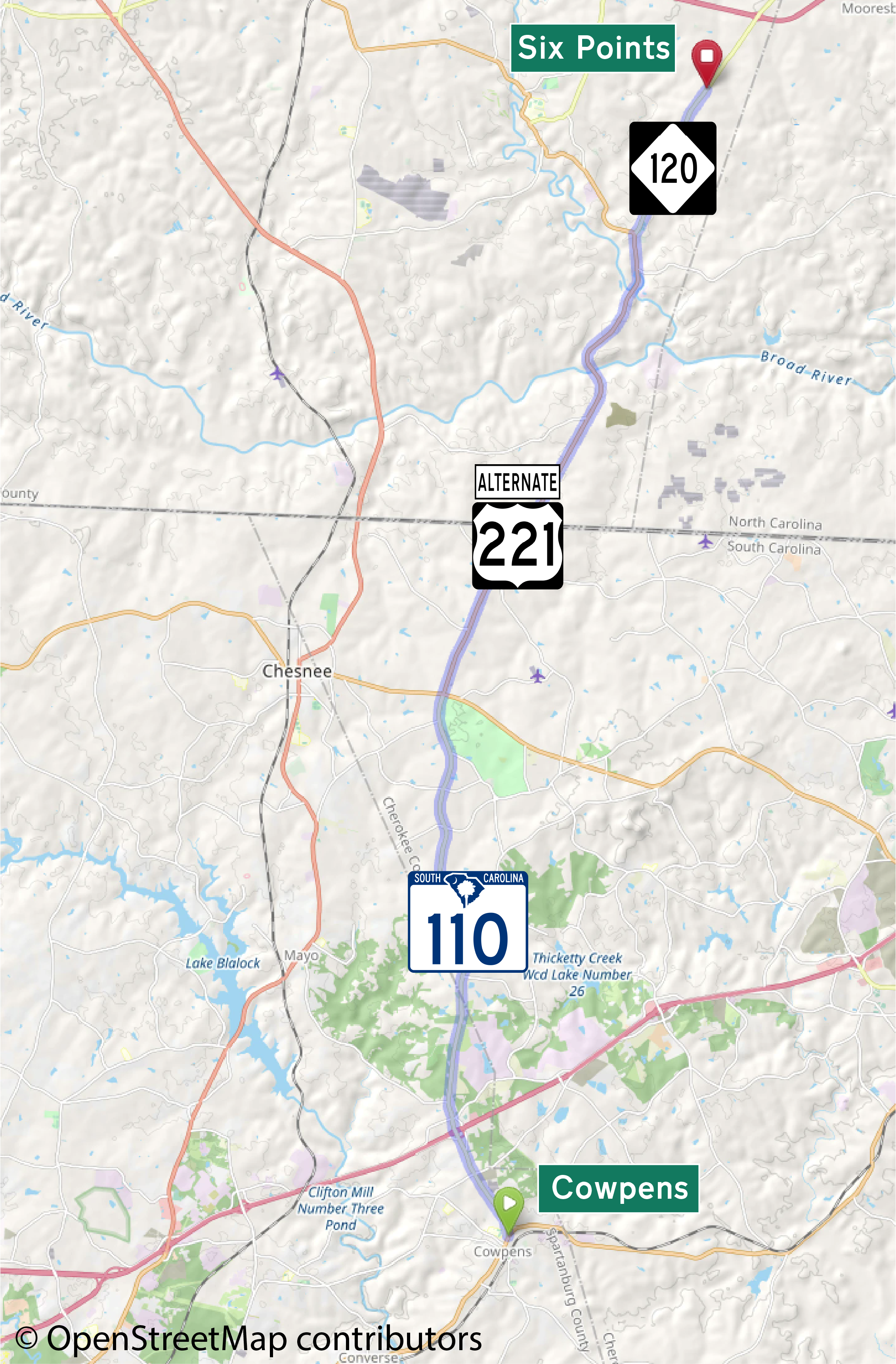 The route passes the Cowpens National Battlefield and passes through the community of Cliffside.