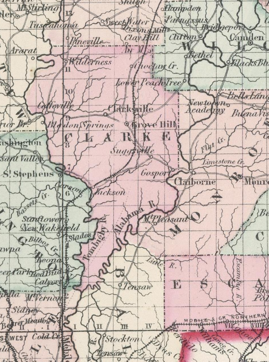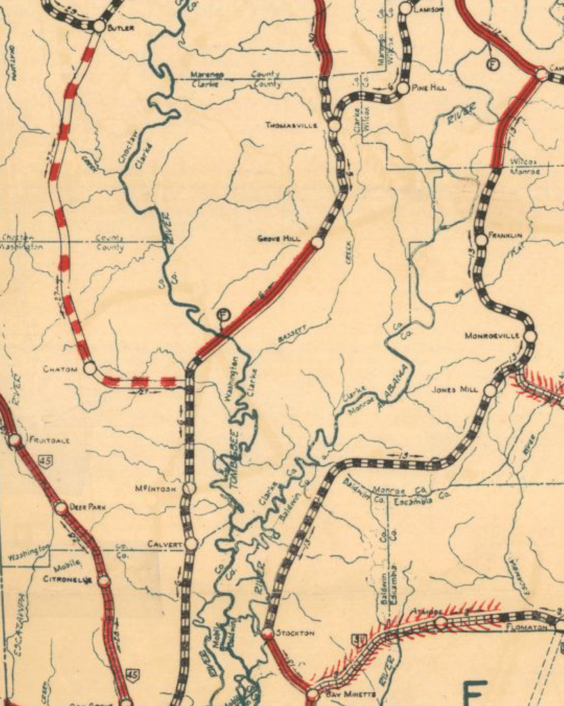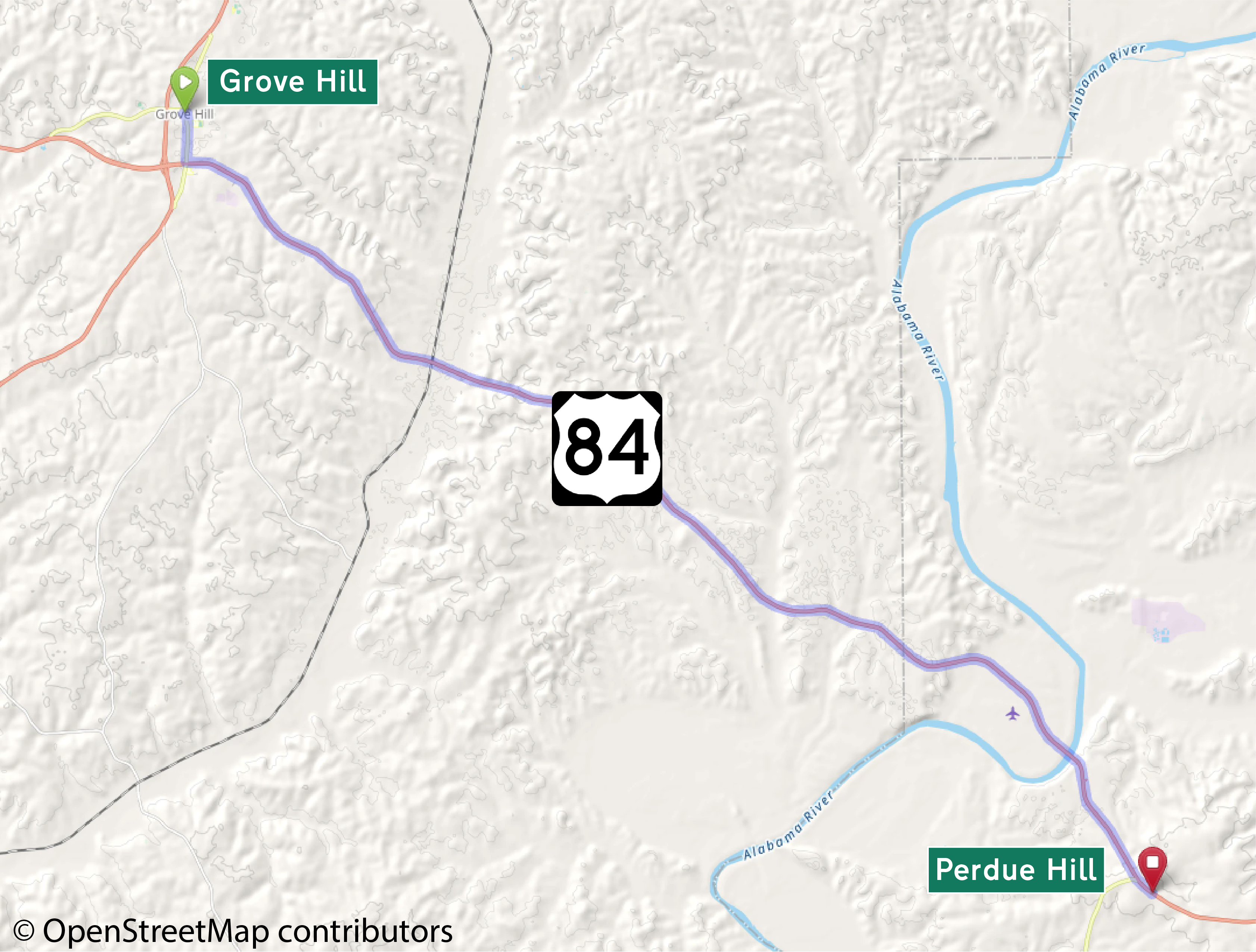 The travel route travels west through a section of Alabama’s Black Belt Prairie to Perdue Hill.