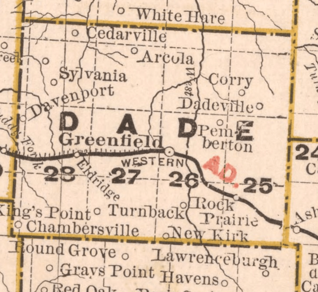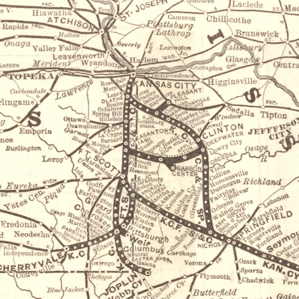 The travel route travels west, just to the north of the former tracks of the Kansas City, Fort Scott & Gulf Railroad.