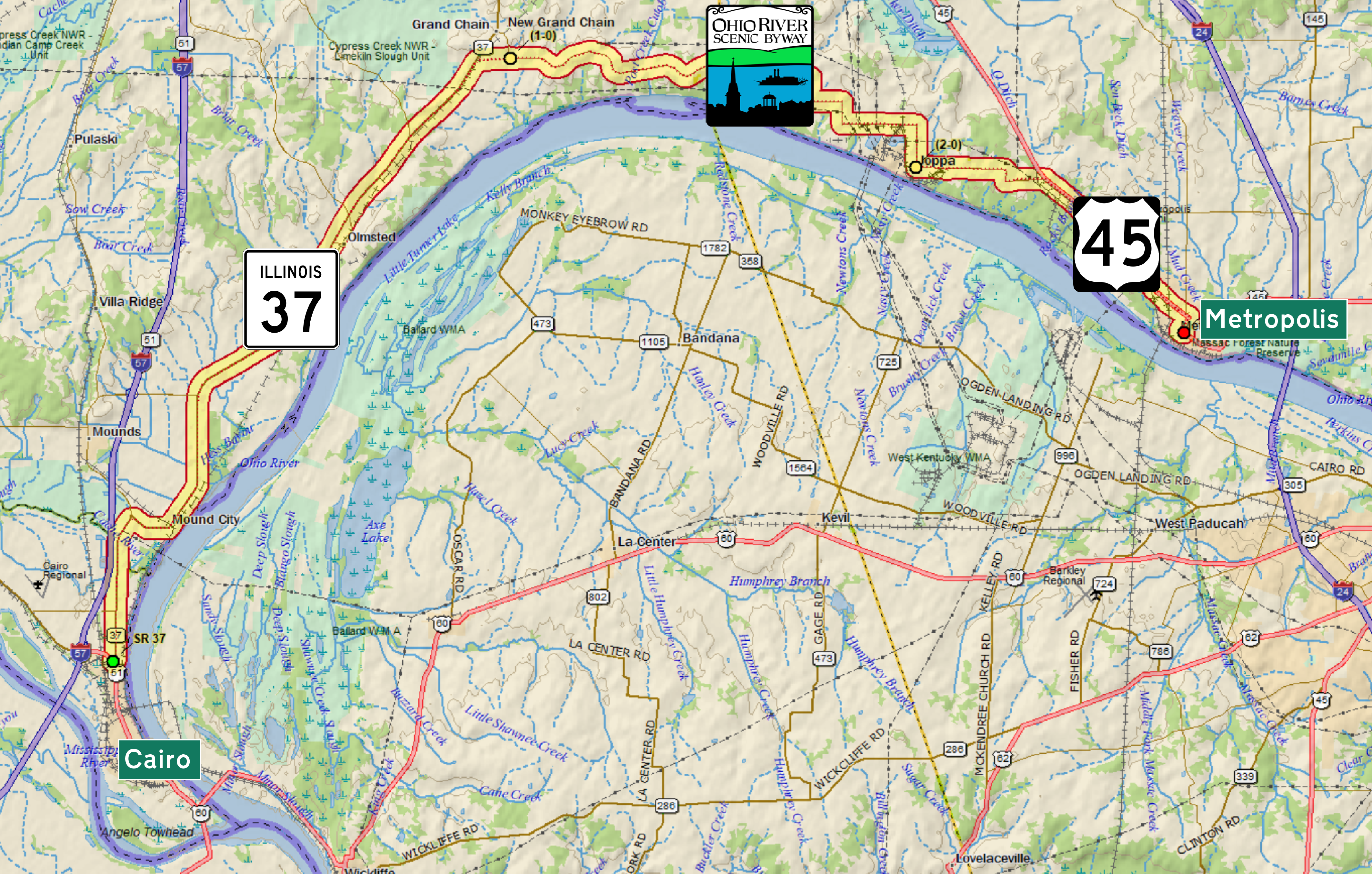 This American auto trail explores Illinois’ Ohio River Scenic Byway, from Cairo Junction east to Metropolis.