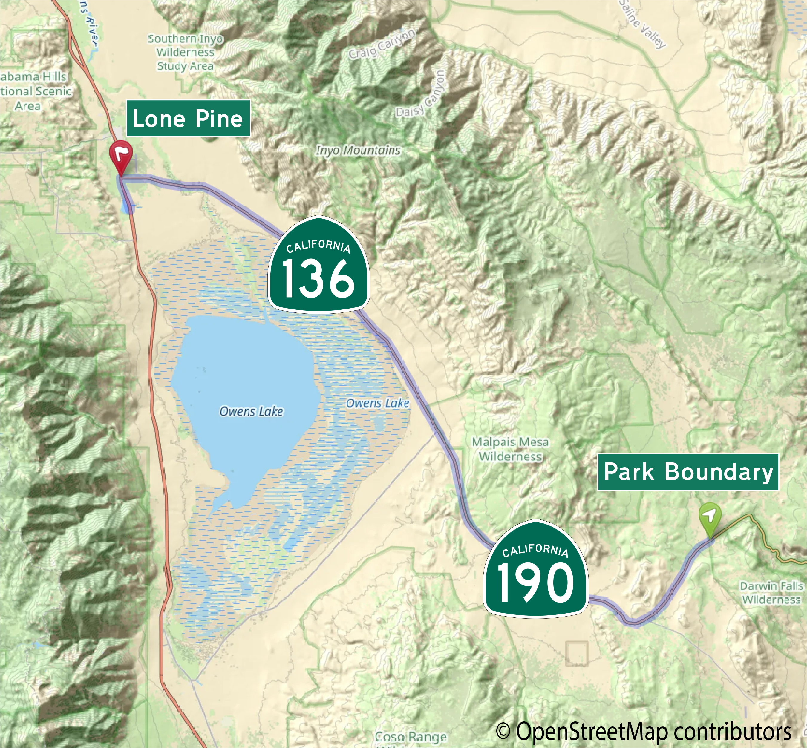 This American auto trail follows California Highways 190 and 136 west from Death Valley’s western park boundary to Lone Pine.