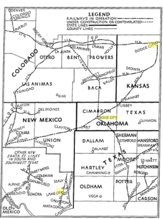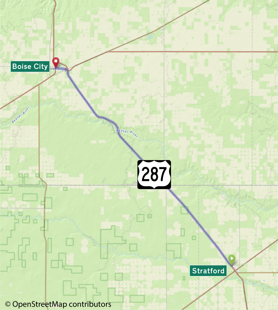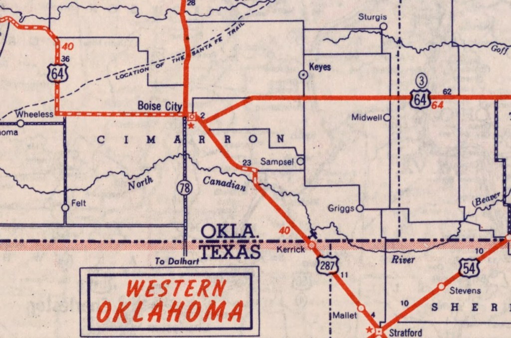 The travel route crosses from the Texas Panhandle into Oklahoma’s, ending in Boise City.