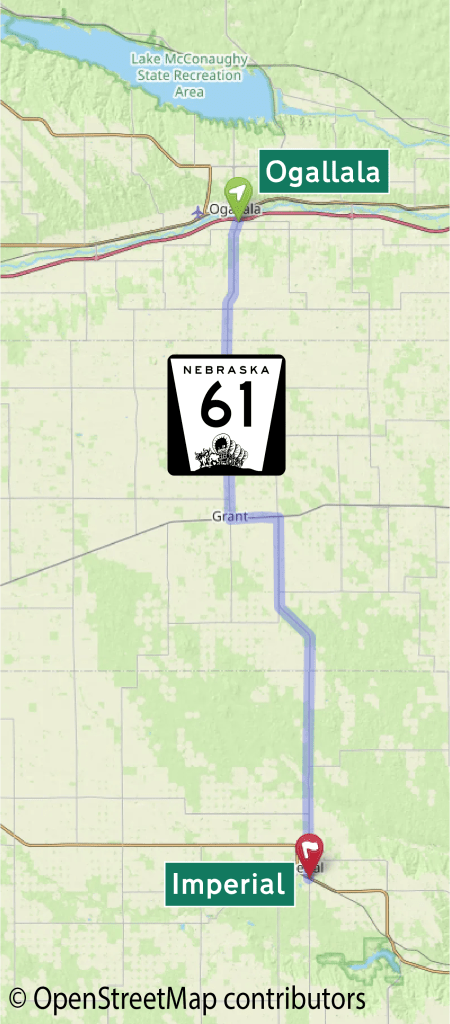 The travel route begins in Ogallala and travels south through Grant to Imperial.