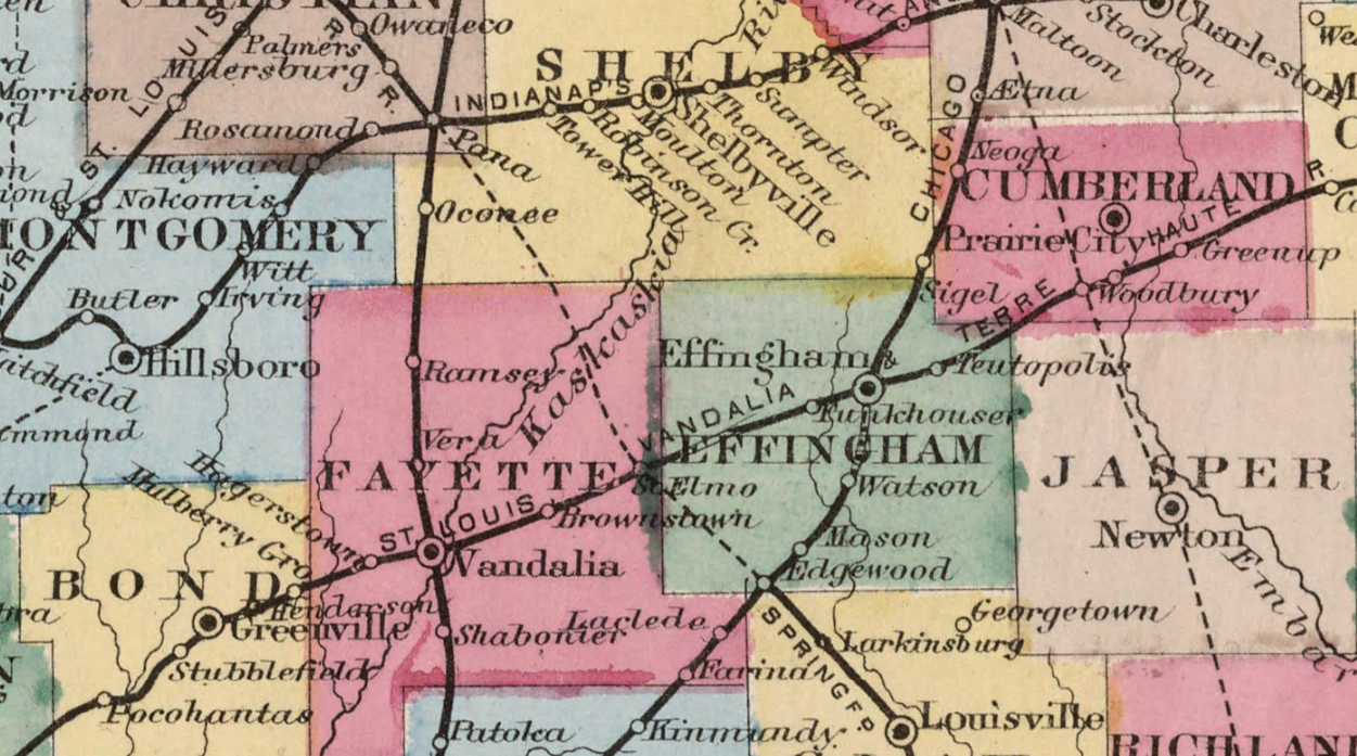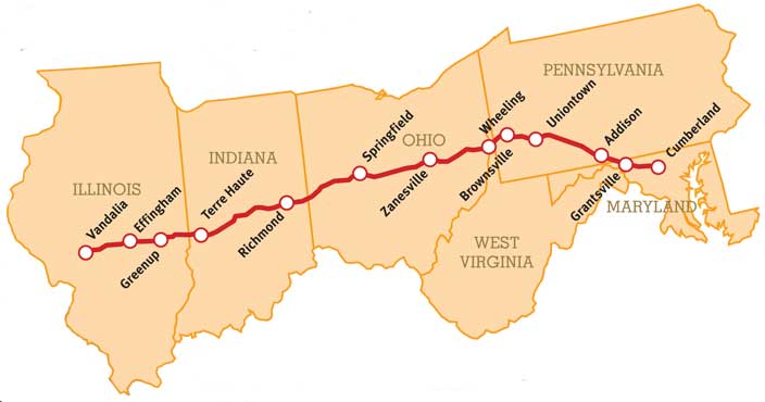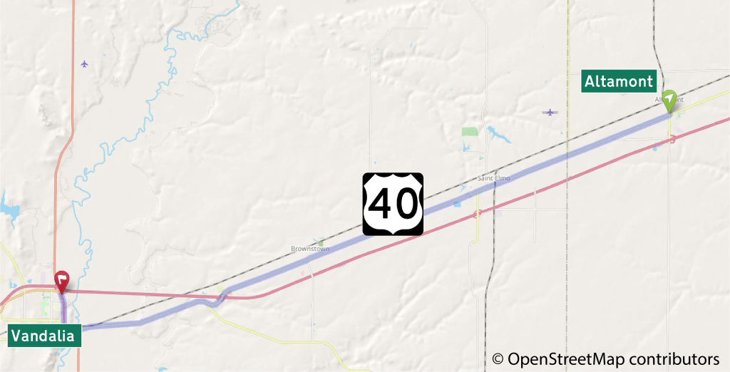 This American auto trail follows the National Road and U.S. Highway 40 from Altamont west to Vandalia, Illinois.