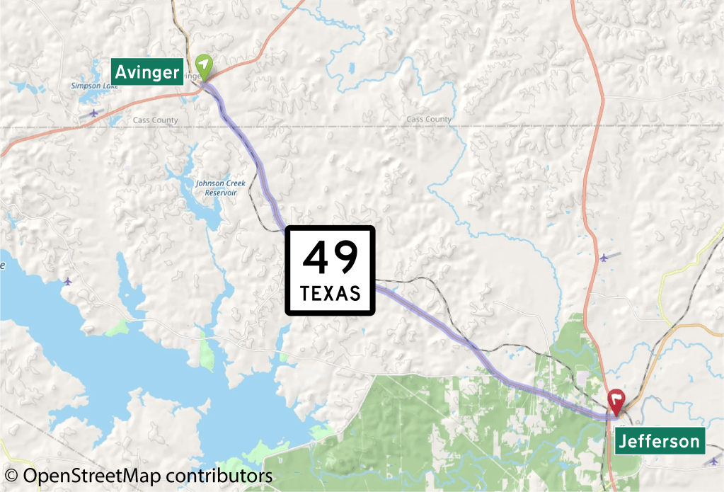 This American auto trail follows the former tracks of the East Line & Red River Railroad from Avinger east to Jefferson, Texas.